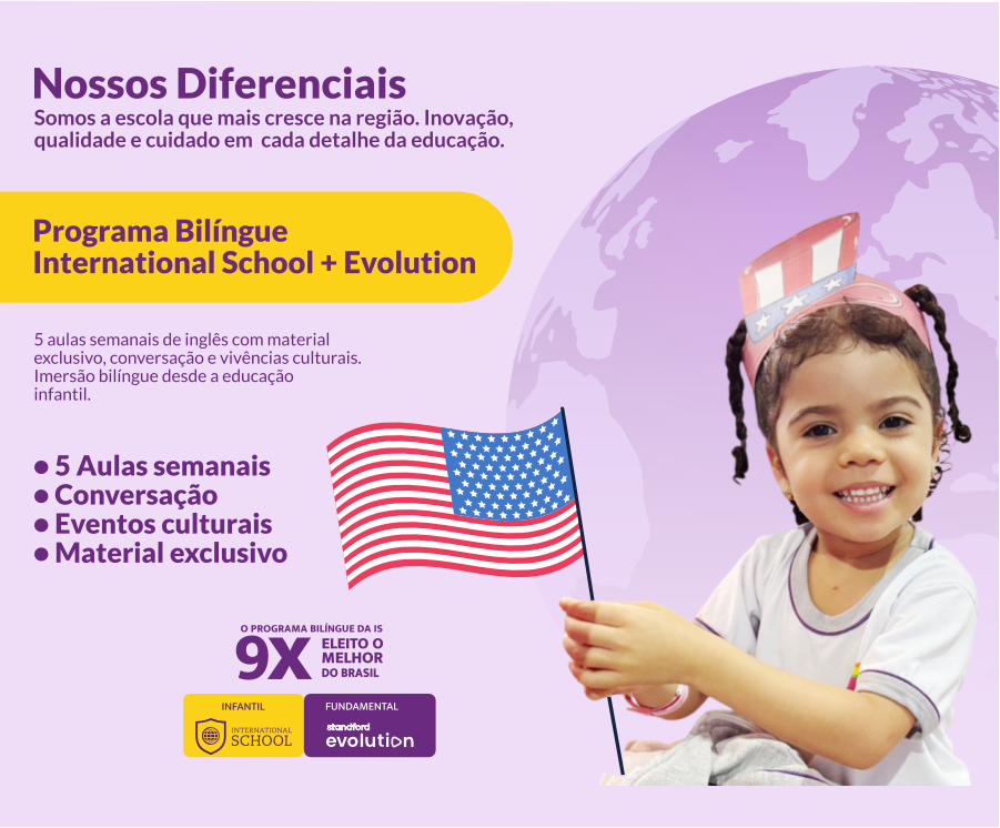 5 aulas semanais de inglês com material exclusivo, conversação e vivências culturais. Imersão bilíngue desde a educação infantil.